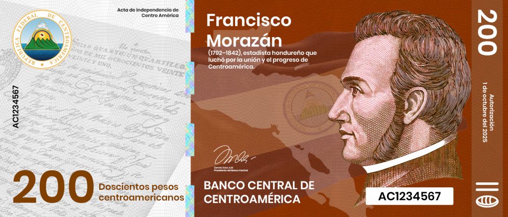A la izquierda, sobre fondo claro, se incorpora una reproducción del Acta de Independencia de Centroamérica, que opera como fundamento documental y símbolo de legitimidad política. Este elemento ancla el billete en la idea de origen institucional y, al mismo tiempo, contrasta con la figura de Morazán: no basta con declarar la independencia; hay que sostenerla y organizarla en un orden común.